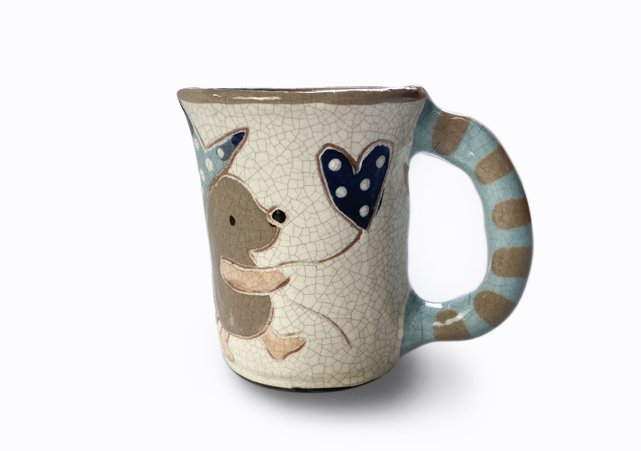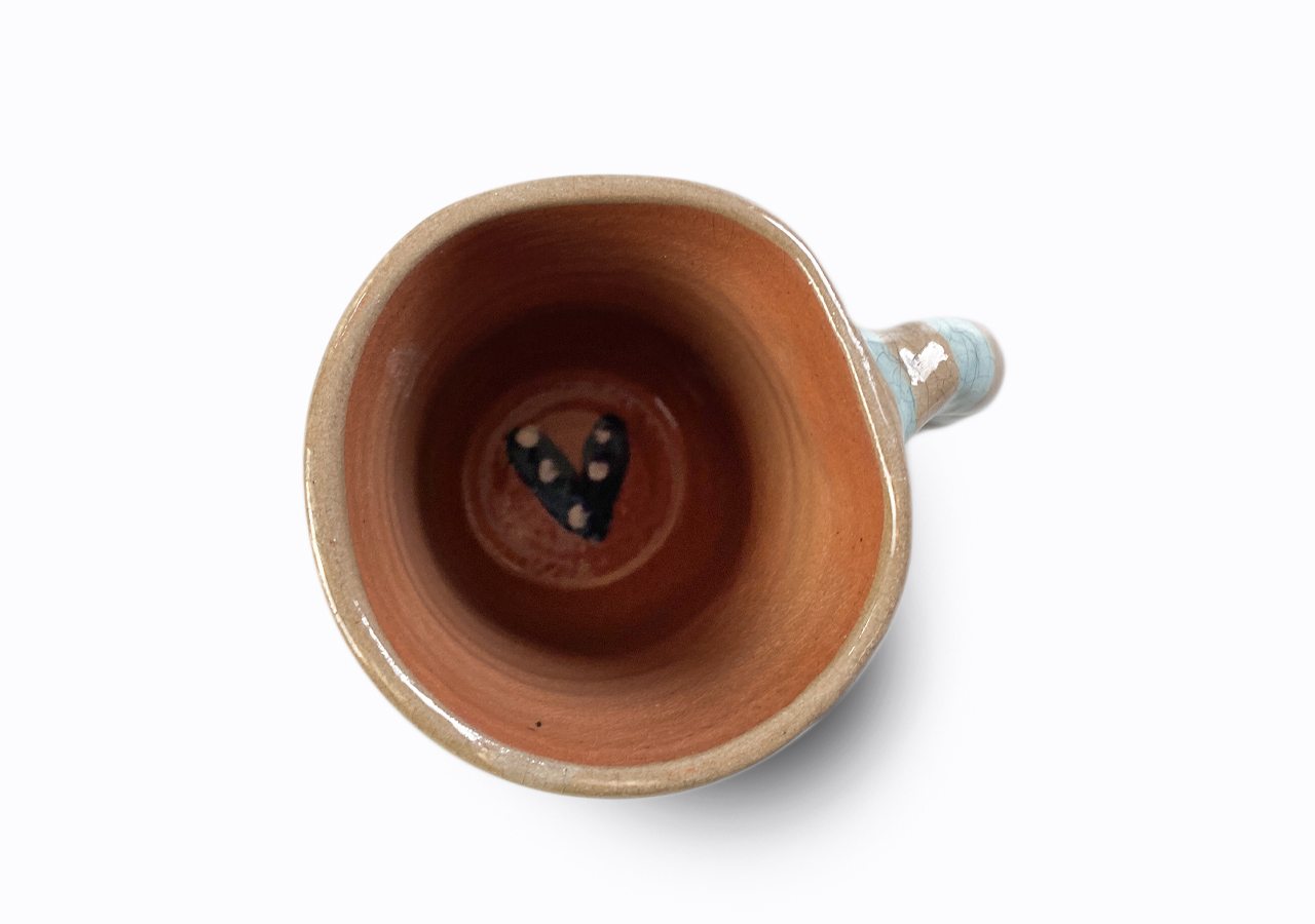 A bögrét a korongon kezdtem készíteni, majd kicsit itt-ott megnyomogattam, hogy igazi görbe bögre legyen. Felfüleztem, szárítottam, majd 1000 fokon többször égettem. Ez a kedves rusztikus bögre lett a végeredmény.