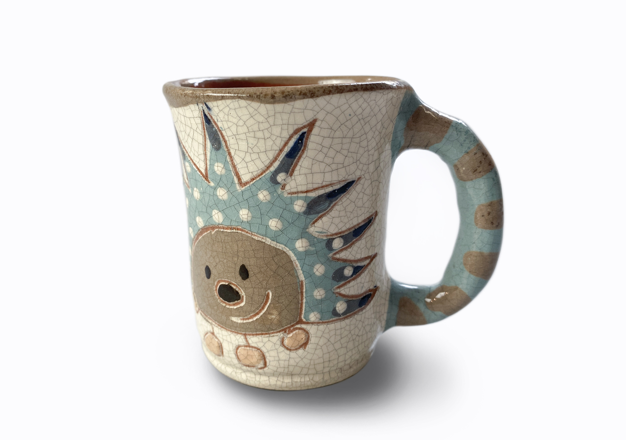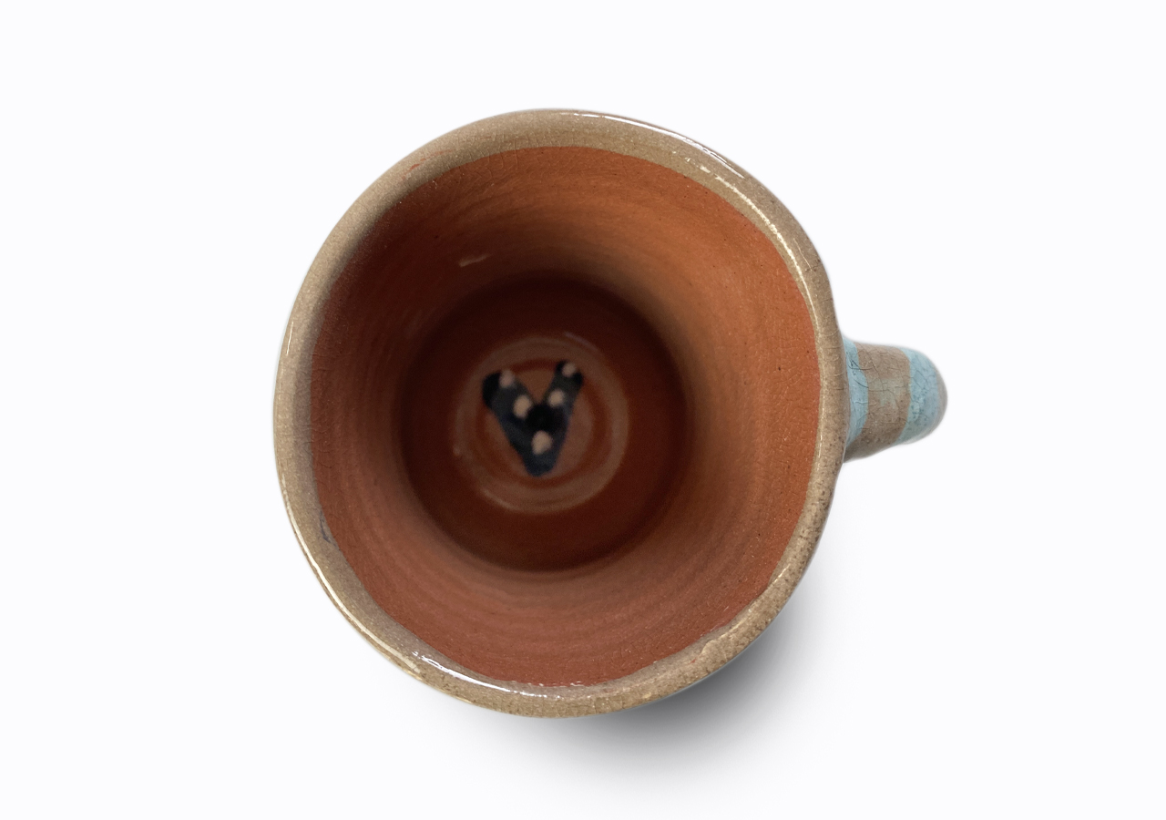 A bögrét a korongon kezdtem készíteni, majd kicsit itt-ott megnyomogattam, hogy igazi görbe bögre legyen. Felfüleztem, szárítottam, majd 1000 fokon többször égettem. Ez a kedves rusztikus bögre lett a végeredmény.