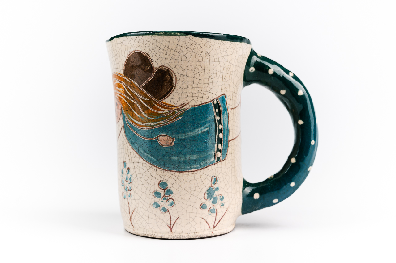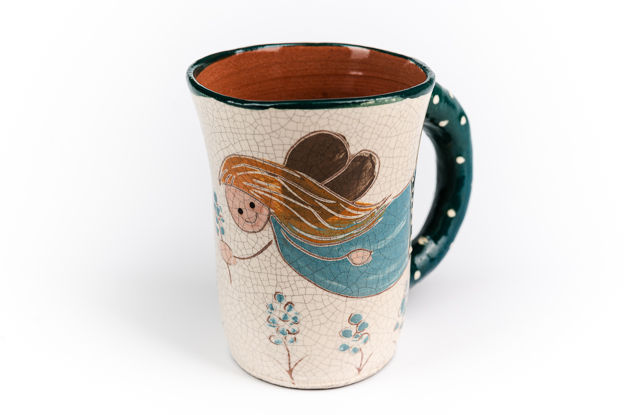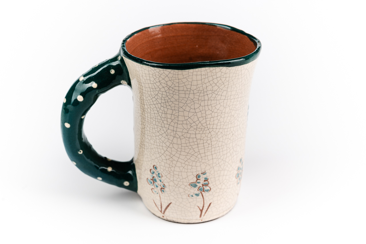 A bögre korongon kezdte életét, majd kapott egy fület, aztán következett a száradás, festés, égetések. A végeredmény ez a kedves rusztikus bögre, ami Rád vár.