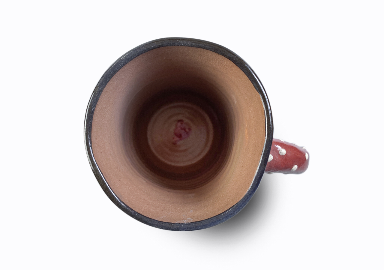 A bögrét agyagból formáztam, ecsettel festettem, speciális mázat égettem rá, felülete rusztikus, antikolt, repesztett.