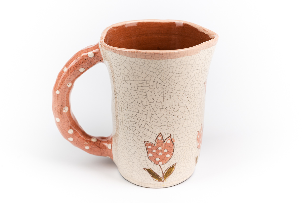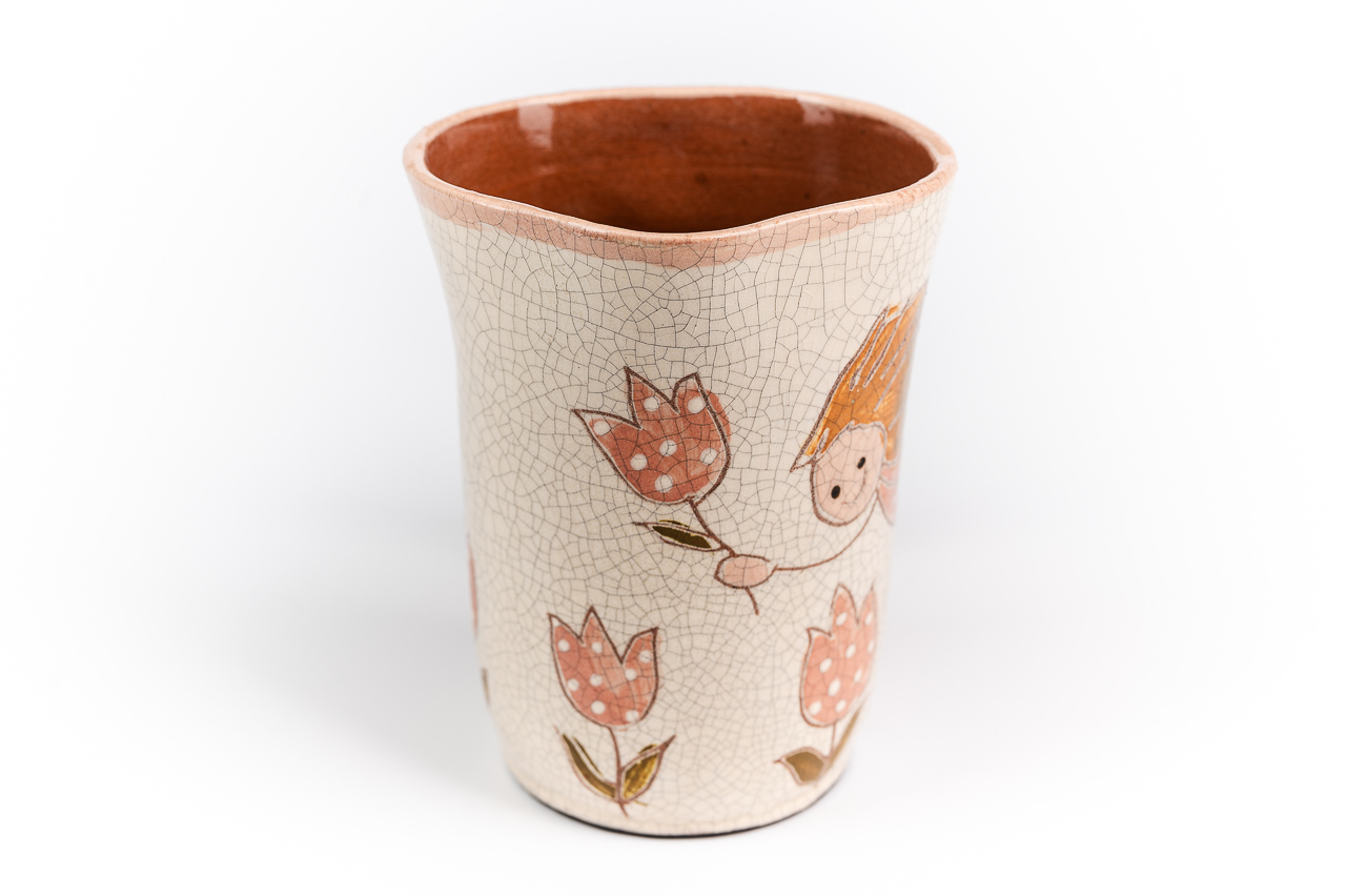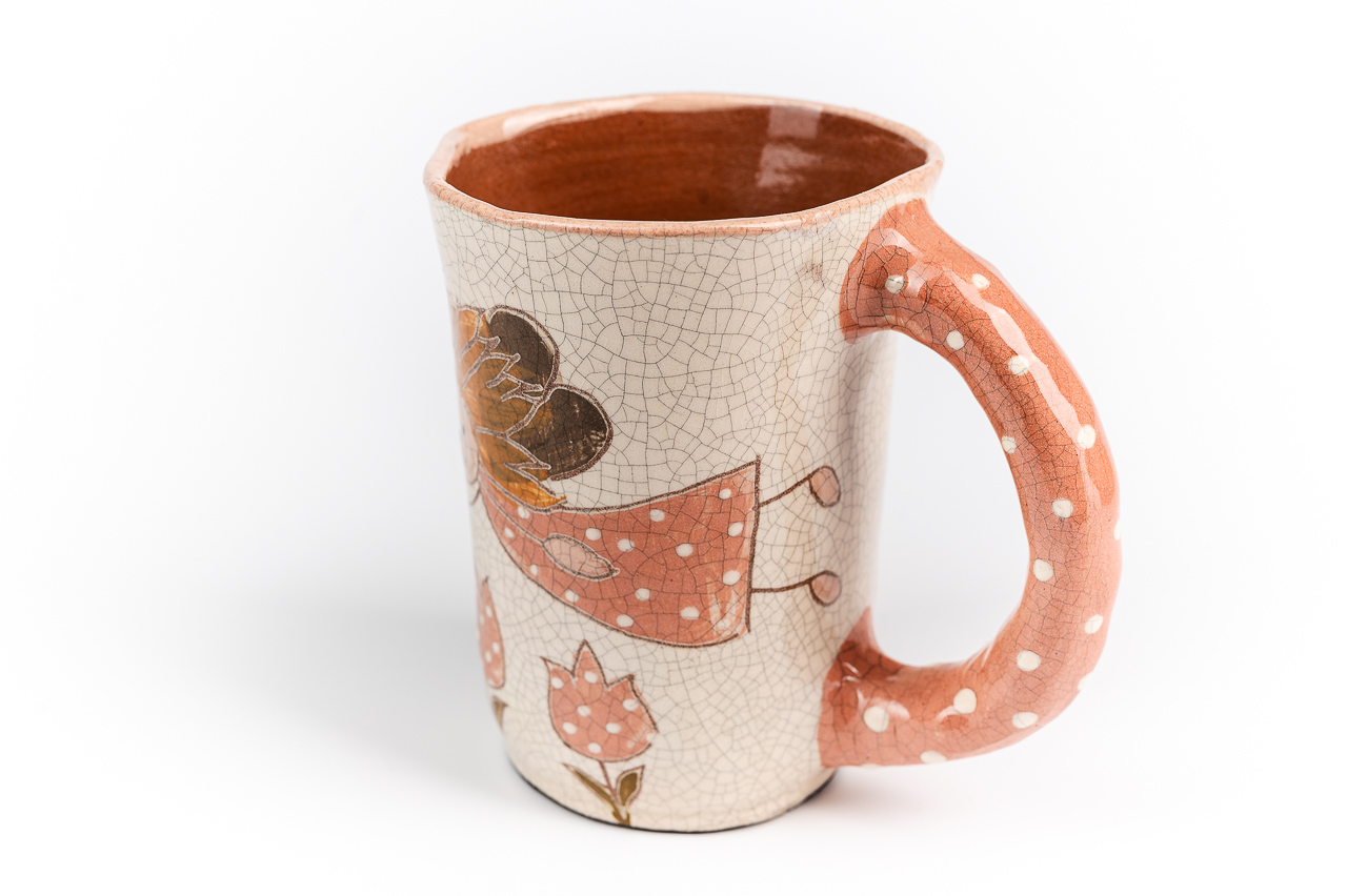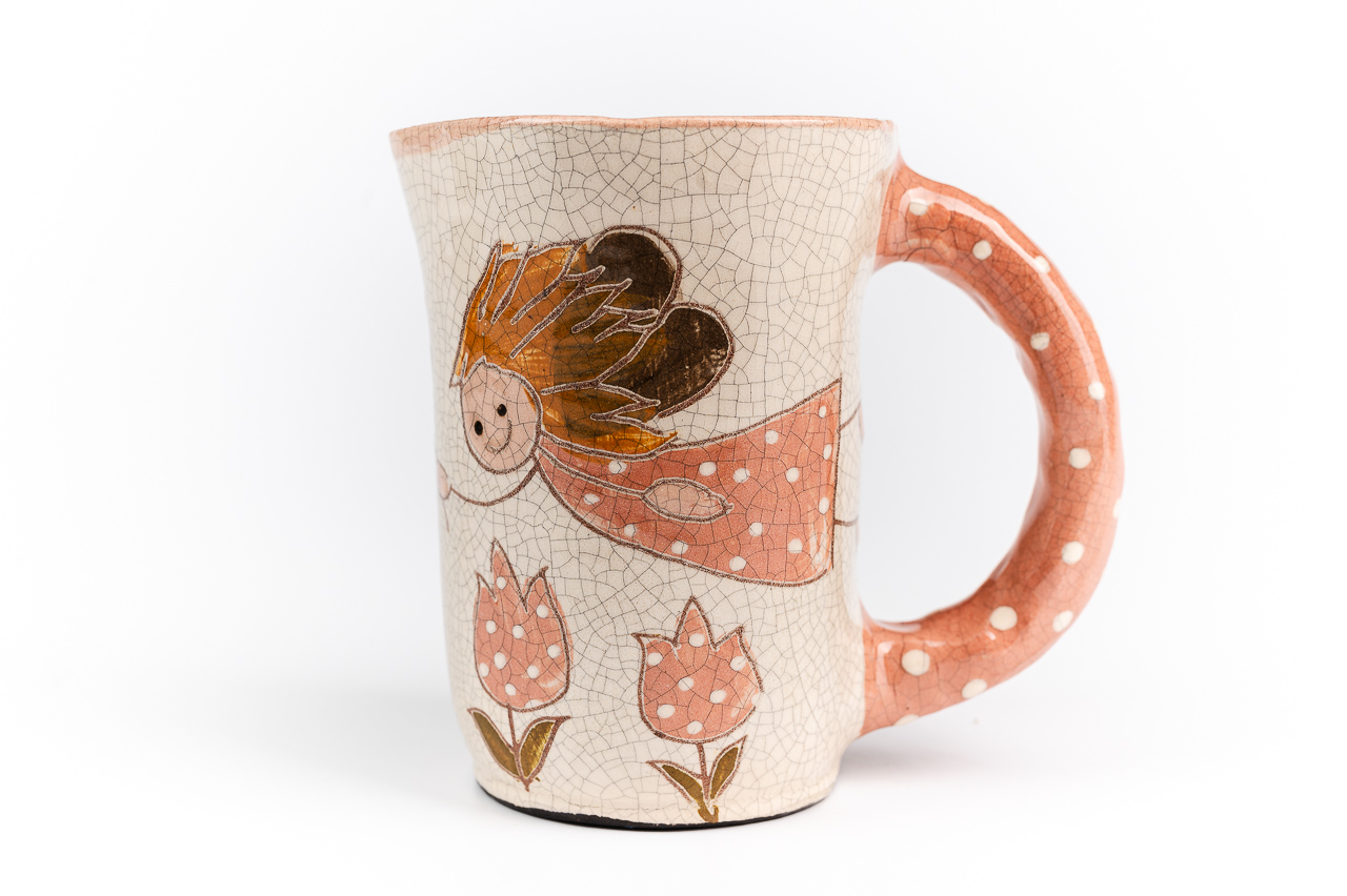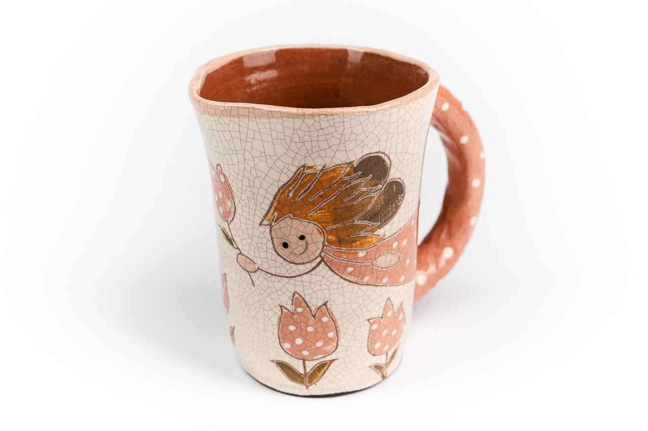 A bögrét agyagból formáztam. Fület kanyarítottam rá, kicsit alakítottam, hogy görbe bögre legyen belőle. Kézzel festettem rá a tündérkét és a virágokat, majd magas hőfokon többször égettem. Íme az eredmény!
