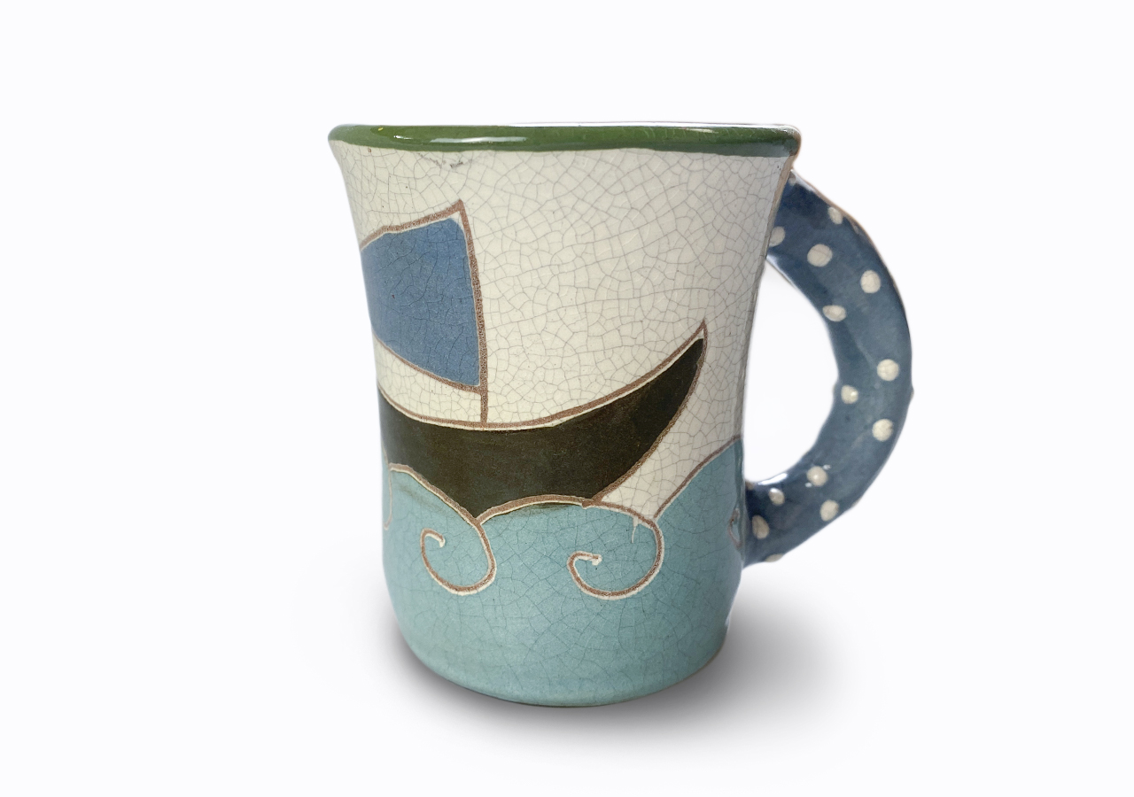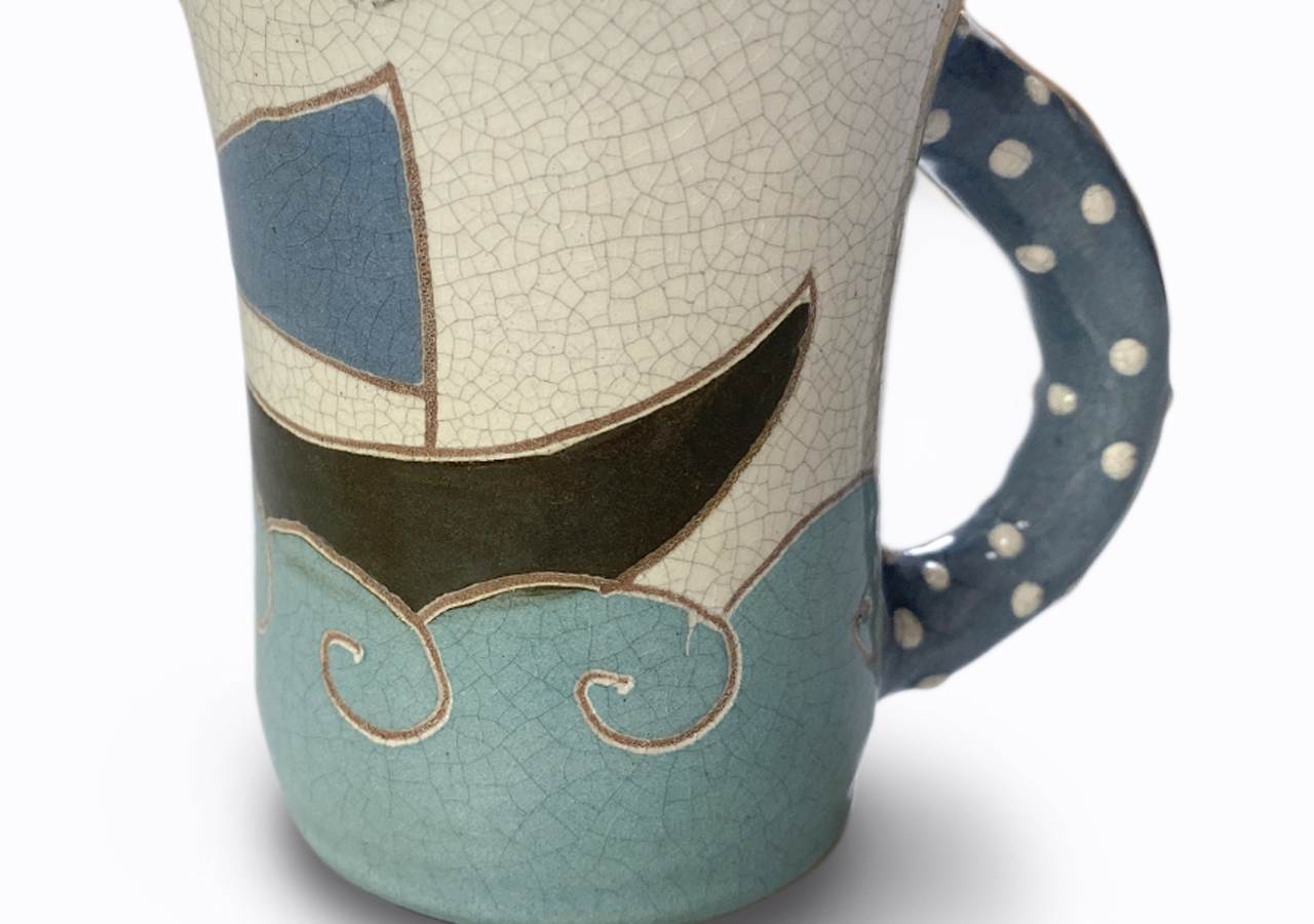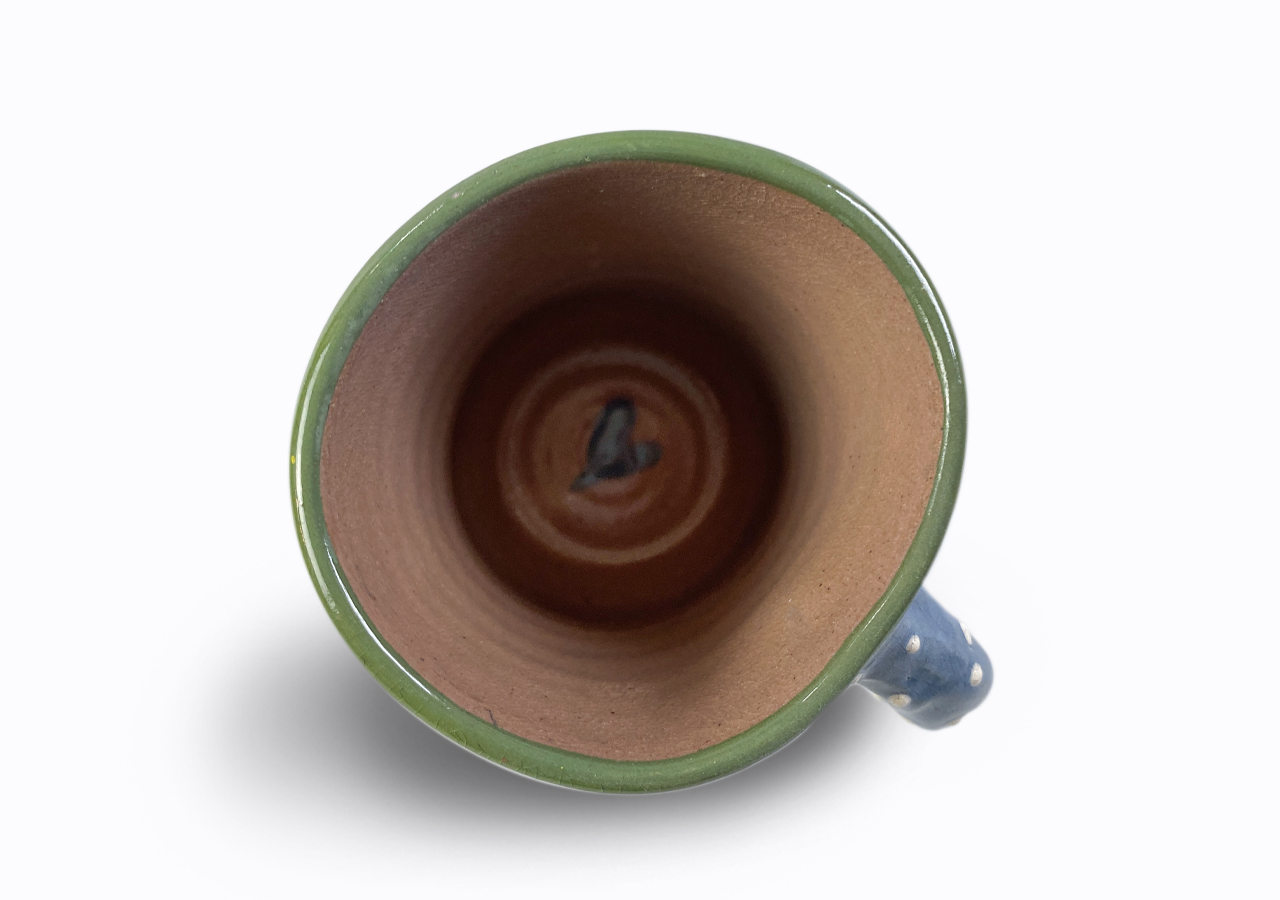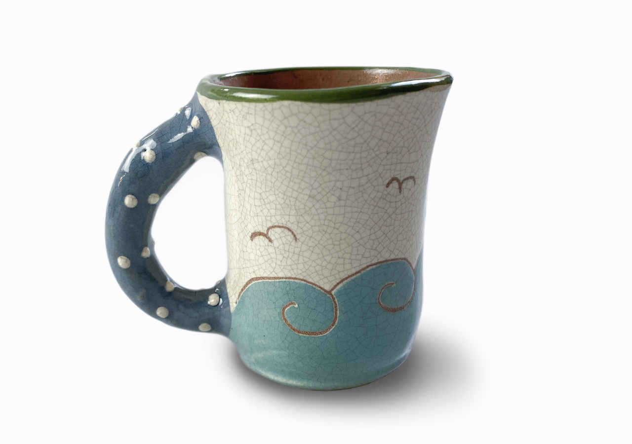 Agyagból korongoztam, megformáltam a fülét, ráragasztottam, majd száradás után megfestettem, kiégettem, mázaztam, újra égettem.